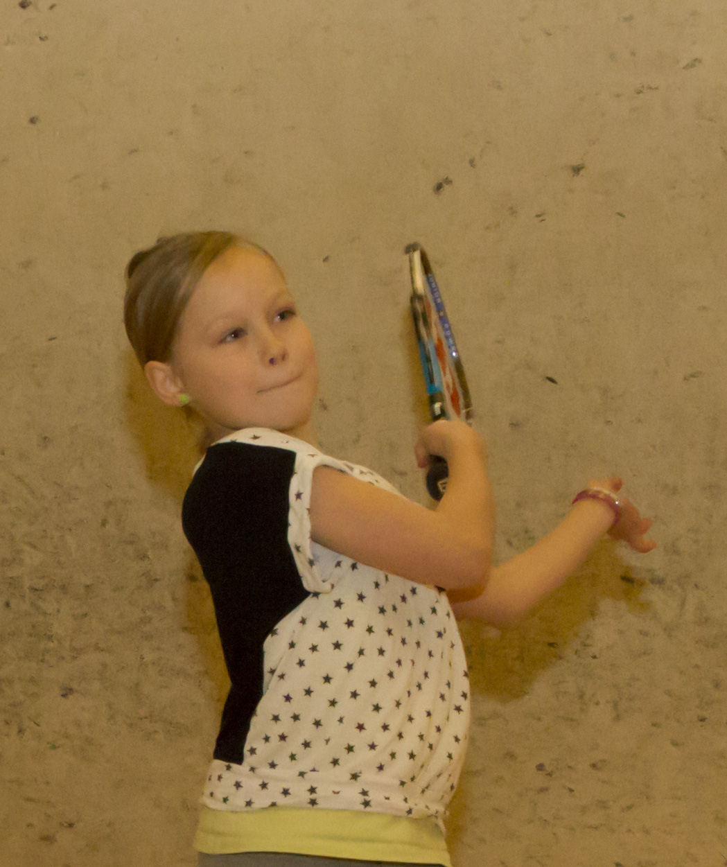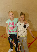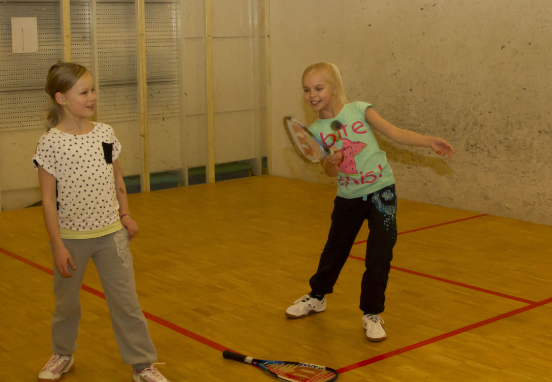 Kaverukset Maria ja Elli ovat nyt harjoitelleet muutaman kerran ja otteet ovat hyvät. Jenna halusi seurata isänsä jalan jälkiä ja tutustua squashiin. Jennan taipumukset ovat myös hyvät.